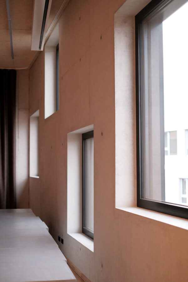 Above it, a more compact and darker volume appears to float over the base. This contrast creates an architectural tension that gives the building a strong identity. The upper floor, more enclosed and punctuated with openings arranged according to the interior needs, accommodates a rehearsal and performance space for the Dadofonic troupe of Ligue HMC, as well as flexible meeting rooms intended for neighborhood associations. These spaces also benefit from a large terrace.